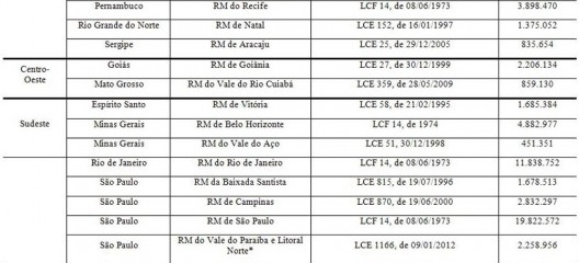 A tabela indica que houve um intervalo de quase 20 anos entre a instituição das primeiras regiões metropolitanas e as novas, orientadas juridicamente a partir da CF de 1988. Isso se explica pelo fato de que, se por um lado a questão urbana tenha se tornado uma questão metropolitana, por outro a forma como as primeiras foram geridas, baseada na centralização política e no tratamento homogêneo de territórios muito diferentes, causou reticências na Assembleia Nacional Constituinte para a sua abordagem. Vale lembrar que no período da ditadura militar, estendido temporalmente até o ano de 1984, prevaleceu a centralização das decisões públicas pelo governo federal, de modo que a questão metropolitana era uma questão federal.