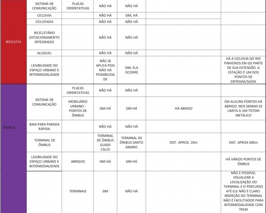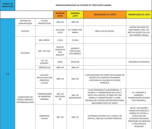 A matriz foi dividida por modos de transporte (a pé, bicicleta, ônibus, metrô, automóvel/motocicleta e táxi). Como a Estação Santo Amaro pode ter excepcionalmente dois acessos – margem leste e oeste foram criadas duas colunas de análise. Consequentemente, a coluna de observações também foi duplicada. Nas células vermelhas foram destacados os principais problemas levantados. Neste artigo não serão discutidas possíveis soluções, a ser feita em momento oportuno.