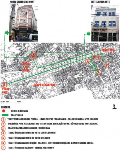Em azul escuro, podemos ver a trajetória de Jorge, morador do grupo estudado que todos os dias se desloca do centro da cidade na Avenida Presidente Vargas até Campo Grande para trabalhar como ambulante. Foi considerado no mapa o trajeto desenvolvido pelo trem, pois como os trajetos do ônibus e do trem são bastante parecidos, optou-se por colocar o trajeto do segundo, embora Jorge faça a maior parte da sua viagem de ônibus. Em vermelho podemos notar o trajeto de Manuel Antônio, que faz este percurso do Centro a Botafogo a pé, para almoçar na Irmandade Zoé. Ele vai para almoçar ou tomar um lanche e volta para dormir todos os dias na Avenida Presidente Vargas. Em azul claro está descrito o trajeto da maioria deste grupo, para tomar banho. Este trajeto inclui a ida até o reservatório da Cedae. Em preto está designada a trajetória feita por cerca de três moradores do grupo. Já o trajeto em branco é de João. Ele realmente procura se utilizar de todos os recursos de que a cidade dispõe. Este trajeto é descrito pela ida diária de João da sua moradia, Avenida Presidente Vargas, até a sua área de trabalho, localizada à Avenida Rio Branco, ou seja, a poucos metros dali. E aos finais de semana, completa seu trajeto junto a hotéis da Central do Brasil. Certamente o percurso que mais impressiona, independentemente de ser executado de trem ou de ônibus é o trajeto feito pelo morador de rua Jorge. Durante a noite ele mora nas calçadas, ocupa o espaço urbano da cidade. Durante este tempo ele está circunscrito dentro do espaço público como morador, utilizando-se do que a cidade pode lhe oferecer: abrigo, comida, convívio com sua rede de relacionamentos, reafirmando desta maneira sua territorialidade. Durante o dia, este deixa a condição de morador de rua para alcançar a condição de trabalhador de rua devidamente certificado por órgãos do poder público. Estamos diante de um verdadeiro paradoxo. O mesmo agente - no caso o poder público - que ordena o território e zela pela sua segurança, o faz segundo duas dimensões bastante contraditórias. Na primeira dimensão legitima uma apropriação segundo relações formalizadas, onde o trabalho é legalizado – Jorge é um ambulante legalizado. Na segunda, legitima uma apropriação informal embora no seu discurso indique tal apropriação como ilegal – Jorge é um morador de rua.