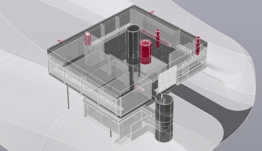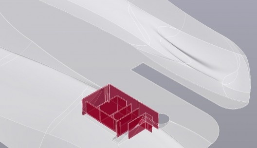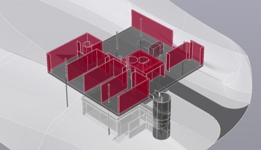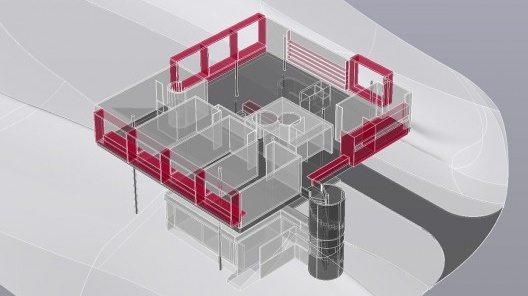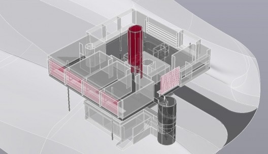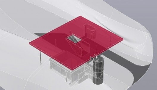 Pavimento térreo: componentes adicionados à volumetria primária: banco como guarda corpo do terraço, paredes da escada de acesso ao piso principal e volume do depósito.