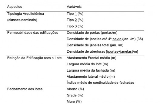 Com relação ao desmembramento dos parâmetros tipológicos em variáveis independentes e análise de sua correlação com o movimento de pedestres, a Tabela 4 mostra os resultados obtidos.