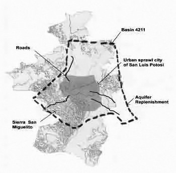 As in the rest of the cities of the country, the urban sprawl of San Luis Potosí has continued to expand up to the slopes of the San Miguelito mountain range, considered an aquifer recharge area. This is the result of a horizontal urban expansion process at very low density that has wasted the opportunity to populate the urban inlands more densely which already have utility infrastructure. This translates into inconsistencies in the urban dynamics that render it incompatible with the preservation of the aquifer and its natural environment; therefore, this expansion of the urban sprawl has itself become the main threat to the stability of the aquifer (010).
