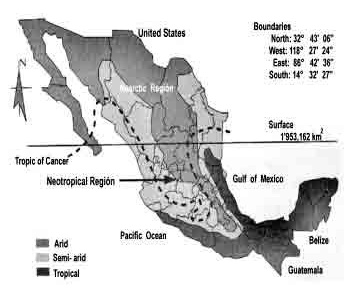 Mexico is a very mountainous country. There is a mountain range along the Pacific coast, and another one along the coast of the Gulf of Mexico. And in the central part there is a high plateau with an average altitude of 2000 meters above the sea level. It is important to emphasize this geological variation because it generates 2 major bio-geographical regions with their respective climates: the Nearctic ecozone, above the Tropic of Cancer (on the 27th parallel north), and the Neotropical below this latitude. The Nearctic zone, in which a dry, arid climate prevails, is located in the northern part of the country. On the other hand, the Neo-tropical regions are semi-arid and tropical, with a warm temperate climate (03). These considerations are important, because from these bio-geographic conditions we may infer which regions of the country are more vulnerable to drought and which to cyclones. However, the climate change has brought about fluctuations in those temperate regions of the central highlands that for centuries have had a stable climate, in terms of rainfall and weather, so that they are now equally subject to climatic disasters. Thus, today any region of the country is exposed to climate disaster of some sort.