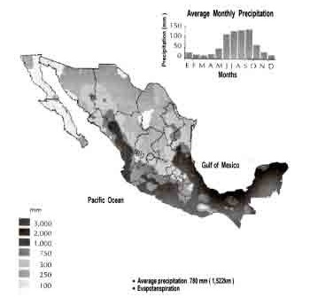The country receives on average 1.515 hm³ of mean annual precipitation (or 1.515 million m³), of which 72% is lost to evapotranspiration, 22% drains superficially down rivers or riverbeds toward the sea almost unutilized, and only 6% is filtered to recharge the aquifers on which the urban population lives and which feed the country's economic activities - agriculture, industry and others. 04 shows that rainfall in the dry region of the north is less than 500 mm per year; in the temperate or semi-arid region of the central plateau precipitations range between 750 and 1500 mm annually, and in tropical regions they reach 3000 mm per year.