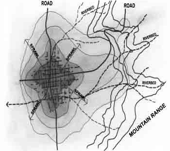 In order to understand better the configuration of the cities and their susceptibility to climate related disasters, we offer a scheme that seeks to summarize their most common geo-morphological characteristics. Most cities in the country were founded on crossroads of trade routes, on mountains rich in minerals and metals, near fertile lands for agriculture, and, of course, on seashore bays. They are generally located on lands with a slight slope, near a mountain range that provided them with water and had forests that were used for building and initially as fuel (firewood and charcoal). The relief of the terrain formed riverbeds for rainwater that descended from the mountains (05).