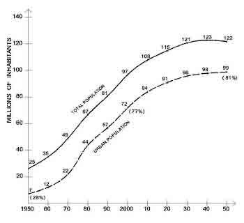 In the last 60 years of Mexico, like any other Latin American country, has experienced the phenomenon of high population growth that quadrupled its population of 26 million in 1950 to 108 million in 2010; but also in the same period of time, the total urban population of the country increased substantially, from 26% in 1950 to 80% in 2010 (Fig.1). As a result, cities grew in size between 7 and 10 times compared to 1950, which meant a struggle by the growing population of all socio-economic levels for vital spaces within the cities - the most visible of which are the extensive low-income settlements. However, from 1990 the population of the country has begun to decrease and is projected to total 122 million by 2050, which calls attention to the fact that there will not be a significant population growth in the future, since 88% of the population already exists at present. This low population growth will reduce the pressure for a future urban expansion in most cities, but urban sprawl already exists in the cities, and the damage to their environments is already done.