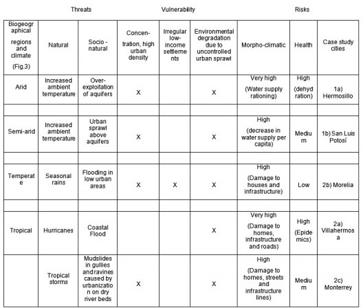Climate change has brought about a very severe impact on the lives of the population of Mexico, either because people live in arid climates with severe water shortages or because they live in tropical climates with too much water. And the Mexican high plateau, which used to have a comfortable temperate climate and sufficient water, is beginning to experience both the effects of a gradually increasing drought due to global warming and floodings from storms caused by the hurricanes that plague both the Pacific coast and the Gulf of Mexico. Table 1 summarizes the various threats, vulnerabilities and risks found in each one of these climates in their respective biogeographic regions, and shows that the country as a whole is under a growing threat from the climate change, with a high vulnerability due to the demographic concentration that has triggered an uncontrolled urban sprawl, thereby degrading the environment that surrounds them. Because they sprawl over all types of terrain, all the cities in the country have areas with a very high-risk of flooding, mudslides or subsidence affecting both the homes and the roads, as well as the functionality of their operating systems. And in cities located on areas with arid and semi-arid climates, the rise in temperature has been reducing the water reserves, which causes their entire populations to be at an increasingly high risk. The last column of the table indicates the examples selected to illustrate the impact that climate change has had on the cities in each biogeographic region.