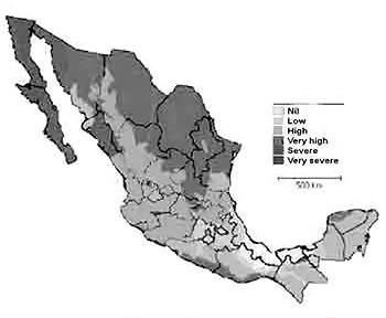 Mexico is facing the worst drought in the last 50 years, 2011 having been the driest year since 1958, according to the National Water Commission (3), and the lack of rain has caused the drought to extend over more than half of the national territory. This drought is classified as strong or exceptional in 6 percent of the national territory, extreme in 15 percent, severe in 20 percent, and moderate in 13 percent, covering an overall 54 percent of the national territory. The states affected by the severest, so-called "exceptional" drought in the north of the country are the Baja California peninsula, Chihuahua, Coahuila, Sonora, and Nuevo León. San Luis Potosí, Guanajuato, Tamaulipas, the Federal District, the State of Mexico, Veracruz, Yucatán, Puebla and Tlaxcala have all suffered the effects of extreme drought (Figs. 7 and 8).