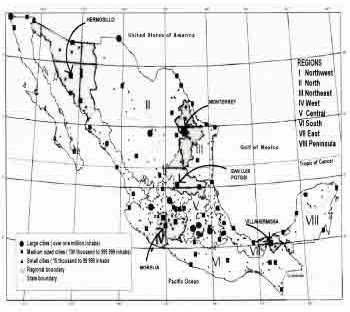 To give an idea of the magnitude of the problem, Mexico is a country with a surface area of 1,959 million km2 and goes between the 14° and 32° latitude north. It has 10,000 km of coastline on the Pacific and Atlantic oceans, along with the Caribbean and the Gulf of Mexico, with a 12 nautical miles strip of patrimonial sea along its coasts (03). There are 4 cities with population of over 3 million inhabitants (the largest of which is Mexico City, with nearly 20 million inhabitants); 18 cities that have, or will have in the near future, 1 million inhabitants; 20 cities with population of more than 500,000 inhabitants; 84 cities with 100,000 to 500,000 inhabitants; 64 cities with 50 to 100 thousand inhabitants, 572 towns with 10 to 50 thousand inhabitants, and 711 villages with 5,000 to 10,000 inhabitants. The rest of the population lives scattered across the vast territory, in small villages of under 5 thousand inhabitants (02). It may be said that each geographical region has a hegemonic city around which the most important industrial and commercial activities are carried out, as well as the social equipment (hospitals, universities, markets), all of which complement the services of the nearby smaller cities, towns and villages; although each one has secondarily links with cities in other regions.