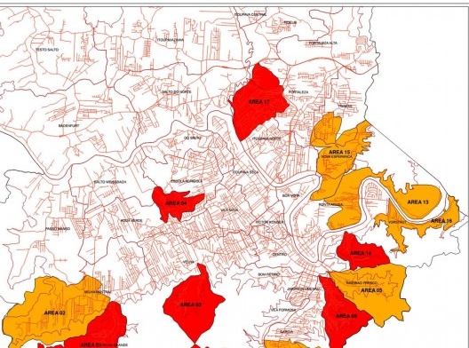 O PMRR abrangeu as 17 áreas com maior recorrência de deslizamentos identificadas na tese de Vieira (2004) (23), que considerou os registros do banco de dados da Defesa Civil municipal. O plano limitou-se às áreas de deslizamento, visto o restrito recurso disponibilizado, tempo de execução e a existência prévia de mapa de cotas de inundação.