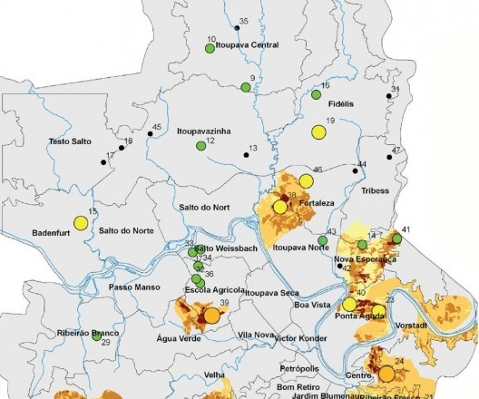 A formação das áreas de risco é potencializada pela morfologia resultante da ocupação de Blumenau em seu período colonial que começa nas planícies fluviais, com as ruas principais paralelas ao rio, se estendendo em direção às encostas (7). Os lotes, inicialmente estreitos e longos, iniciavam-se junto ao rio com área habitacional e comercial, e ascendiam em direção às encostas, ocupada por atividades agrícolas e pecuárias (8). As áreas junto aos rios (várzeas) sempre se mostraram suscetíveis às cheias e os lotes coloniais se converteram gradualmente em lotes de menor tamanho, com aberturas de novas vias perpendiculares às principais e sem respeitar o relevo, potencializando a ocorrência de deslizamentos (9).