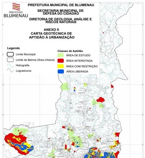Também a criação de um cadastro nacional dos municípios com áreas suscetíveis à ocorrência de deslizamentos de grande impacto, inundações bruscas ou processos geológicos ou hidrológicos correlatos, indica que os municípios inscritos no cadastro, como Blumenau, deverão: i) elaborar o mapeamento de suscetibilidades; ii) identificação de ocupações em áreas suscetíveis e a realização das análises e mapeamentos de risco; iii) elaboração dos planos de contingência; iv) plano de implantação de obras e serviços; v) criar mecanismos de controle e fiscalização e; vi) elaborar a carta geotécnica de aptidão à urbanização, estabelecendo diretrizes urbanísticas voltadas para a segurança de novos parcelamentos do solo e para aproveitamento de agregados para a construção civil.