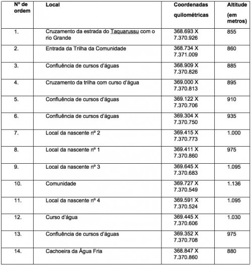 O percurso teve início na estrada do Taquarussu, no trecho em que o rio Grande a cruza. Seguiu-se pela estrada por cerca de 100 m e entrou-se na trilha da Comunidade propriamente dita que margeia, em grande parte, cursos d’água. Durante o percurso foram identificadas 4 confluências de rios e registrados 14 pontos de controle, com suas respectivas coordenadas, ilustradas no mapa e na fotografia aérea. O caminho percorrido pode ser inferido no citado mapa acompanhando-se a numeração crescente dos pontos de controle.