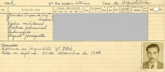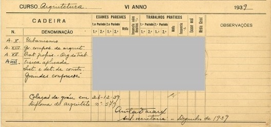 A ausência de formandos arquitetos, em 1938, transfere para 1939 a 1ª Colação de Grau (40) a conferir título de “arquiteto” a cinco alunos: Galiano Ciampaglia (n.579) (41), Igor Sresnewsky (n.580), Manoel Amadeu G. de Soutello (n.581), Miguel Forte (n. 582) e Sophie Elma Muller Capps (n.583). Em contraponto ao diploma de “engenheiro-arquiteto” e de acordo com o Art. 92º do Regimento Interno de 1937 (42), o verso das fichas de alunos matriculados no Curso de Bellas Artes Architectura identifica o diploma de “arquiteto” concedido ao final do curso.