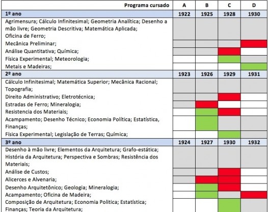 Com a ENBA vinculada à Universidade do Rio de Janeiro (Decreto 19.851) e Lúcio Costa à frente da direção da Escola, o Curso de Arquitetura ganha autonomia (Decreto 19.852, Art. 223), oferece novas cadeiras e seriação (Art. 228 e 230) e confere, ao seu final, diploma de “arquiteto” (Art. 20i). Segundo matrículas da ENBA disponibilizadas para consulta (15), a seriação estabelecida em 1931 foi mantida mesmo depois de Lúcio Costa ser exonerado da direção da Escola em meio a uma greve estudantil contra os acadêmicos (16). No caso, o discurso sobre as propostas do mestre não terem vingado não encontra eco na Tabela 1 organizada até 1936. Apesar de em 1934, Gustavo Capanema assumir o Ministério da Educação e Saúde Pública e ampliar a seriação para seis anos, o conjunto de disciplinas é mantido. No caso, Composição de Arquitetura é estendida para quatro anos.