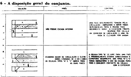 Para entender a proposta do semi-duplex, cabe rever as pranchas de 1954 aprovadas na Prefeitura de Belo Horizonte para o projeto do Conjunto JK. Dentre essas, na planta do bloco A aparecem dois tipos de organizações nos andares habitacionais. Do lado direito, saindo do núcleo de elevadores com forma triangular, os apartamentos se organizam dentro de uma serie repetitiva de paredes portantes, regularmente distanciadas, que resolvem cinco tipos diferentes de apartamentos, todos estes de um andar. Mas, do lado esquerdo do núcleo de elevadores, se situam os semi-duplex, aparecendo o corredor coletivo a cada dois andares apenas. No caso do bloco B, de 36 andares, este tipo de organização e utilizado em todos os andares a partir do décimo pavimento.