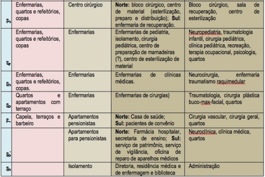 O projeto segue tais preceitos. O subsolo abriga os serviços gerais e o térreo, o setor dedicado à dietética, onde são preparadas e distribuídas a alimentação dos internos, e o serviço clínico central – as clínicas, o setor auxiliar do diagnóstico e da terapêutica, além do ambulatório. A sobreloja abriga as unidades administrativas (econômico-administrativa, serviços auxiliares da administração e admissão e registos), de serviço social, atendimento de urgência, associado às diversas clínicas localizadas no pavimento térreo.