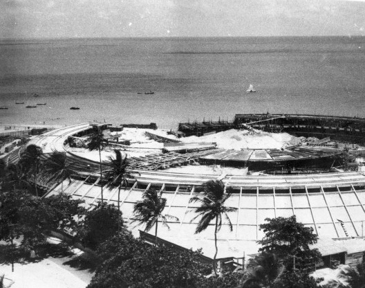 Nessa porção Leste do anel externo do hotel, tornou-se necessário, devido à maré, a utilização de um embasamento de pedras calcárias, que passaram a funcionar como “gabiões”(14). Sobre esse embasamento de pedras, que na época da construção do hotel chegava a, aproximadamente 2 metros de altura, ainda se fez necessário à construção de um ambiente oco, vazio – uma espécie de quebra-mar – para permitir o fluxo e refluxo das águas do mar sob a primeira laje de piso, correspondente ao térreo (cota +5,00m) da edificação do hotel.