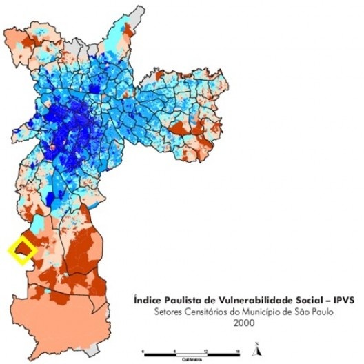 O Fundão do Jardim Ângela localiza-se na zona sul da cidade de São Paulo, com 313.015 habitantes (6), imerso em área de preservação de mananciais, às margens da represa Guarapiranga, alternando colinas de declividade acentuada e vales, cuja ocupação urbana é maciçamente irregular e precária, quase completamente desprovida de infraestrutura, saneamento básico, deficitário, sistema de transportes e equipamentos urbanos sofrível e com um dos maiores Índices Paulistas de Vulnerabilidade Social (7) da cidade. O método de análise para aproximação ao problema implica no entendimento das esferas metropolitana, regional e local, de um território típico do binômio perverso centro-periferia, nesse caso extremo, com o agravante de compreender ocupações habitacionais de caráter emergencial e precário sobre áreas estratégicas de proteção de mananciais metropolitanos. Tratados temas da geomorfologia, sistemas viário e transportes, tecidos urbanos, infraestruturas, equipamentos, marcos referenciais tangíveis e intangíveis, histórico, legislação, população, para diagnóstico e leitura da paisagem (8), aflora o drama humano e ambiental conflituoso que transcende ao caráter imediato do locus e revela-se como sistema planetário colapsado (9). Imensa extensão da cidade não é cidade – um amontoado despossuído e desprovido. Temos vasta proporção de natureza submetida, não preservada e a compressão e esparçamento de territórios agricultáveis ou cultiváveis.