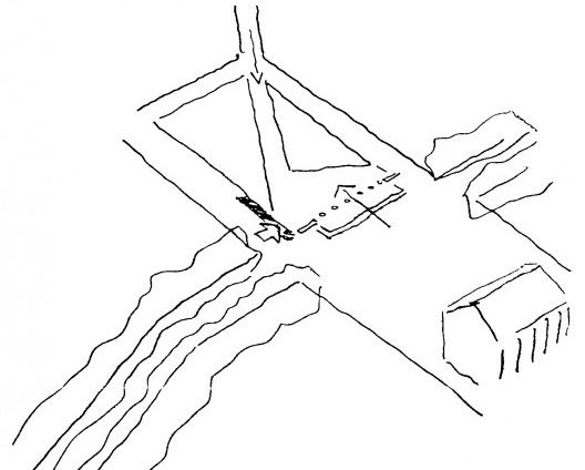 “Bela tarde ensolarada. As motos sobem as rampas, roncam, voam. O trem de subúrbio faz um barulho horroroso. Literalmente insustentável quando se está no mesmo nível. Um pouco menos forte quando se está na parte alta. As pessoas deitam-se na relva [...] Percorrendo o terreno, imagem mental de uma grande forma, curvilínea que se acenta sobre o relevo, prolongando-a e ampliando-a, partindo do boulevard, atrás da igreja, encurvando-se e se expan-dindo no lugar mais largo. Espécie de uma grande cocha escalonada cujo o centro estaria no sul e sudoeste, dando as costas para o trem, fazendo deste lado uma muralha abrupta e plena”.