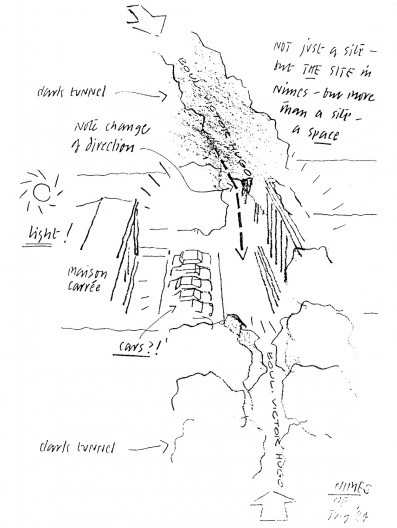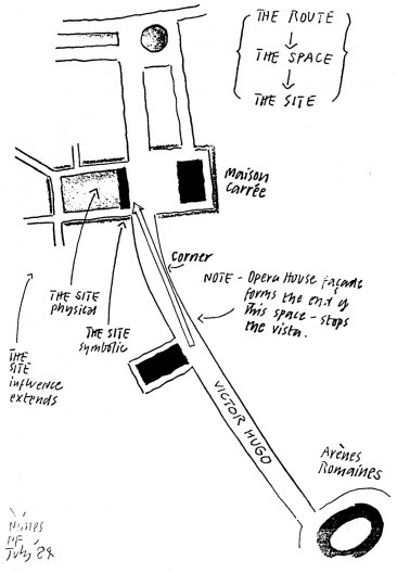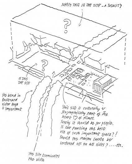 O segundo grupo de argumentos está nos remanescentes que são conservados dos interesses de Foster, quando da fase de preparação do concurso, ele descobre em Nimes o local da futura Médiathéque (utiliza-se aqui os documentos apresentados, em maio de 1993, no saguão do Carré d'Art). Uma primeira série de croquis anotados, datados de julho de 1984, mostra uma descoberta refletida sobre o local. O arquiteto observa a intensidade da luz, vê os contrastes da sombra acolhedora que reina sob as árvores do boulevard Victor Hugo, que ele chama de dark tunnel; ele nota estupefato que os carros estacionam obliquamente entre a Maison Carreé e a colunata do antigo teatro. Ele conserva o ponto de vista livre, views over traffic, que o pódio da colunata oferece sobre a Maison Carreé. Dentro desta visão seletiva, encontra-se um duplo inventário; o inventário dos elementos físicos: o espaço disponível, seja ele amplo (a praça), ou fechado (o boulevard); a luz brilhante e o seu contrário, a sombra; e o inventário das fontes culturais, que informa sobre a capacidade do local de montar espetáculo. Os pontos de vista, os obstáculos são registrados com hierarquia; a percepção do monumento antigo, com os carros estacionados, mostrando-se indignos do local, dão lugar a uma proposta de um espaço público, associando o edifício a ser construído com os volumes existentes.