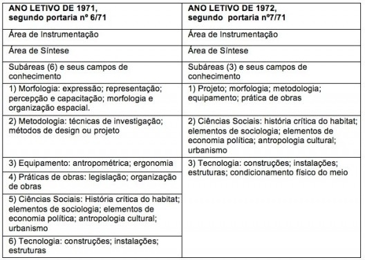 Criou-se a forma organizativa permitindo máxima versatilidade. No começo, a proposta dividiu-se em três áreas relacionadas: área de projeto: coluna vertebral, agrupando Composição Arquitetônica, Elementos de Arquitetura e Sistemas de Representação; área cultural: à História da Arquitetura, se somavam Economia, Política, Psicologia e Ciências Sociais; e área tecnológica: agrupava Construções, Tecnologia dos Materiais, Instalações, Organização de Obras, Acústica e Iluminação e Matemática.