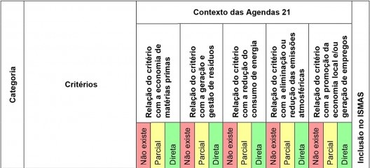 Conforme o método de recorte elaborado para estabelecer quais critérios, dentre os 39 inicialmente propostos teriam potencial para serem mantidos ou incluídos ao ISMAS, o critério deveria apresentar, obrigatoriamente, cinco relações diretas com as abordagens obtidas a partir das Agendas 21; quatro diretas mais uma parcial ou uma inexistente; ou pelo menos três diretas somadas a duas parciais, conforme apresentado na figura acima. A partir da análise (ver quadro abaixo), foram obtidos os critérios com potencial para serem incorporados ao ISMAS, buscando assim ampliar a abrangência conceitual, considerando ainda a necessidade de manter a característica praticidade, visando a efetiva utilização por projetistas.