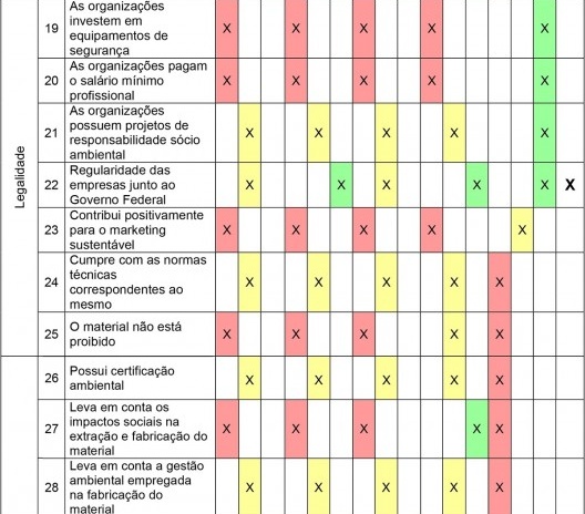 A relação do critério com cada uma dessas abordagens, pode acontecer de forma inexistente (vermelho), parcial (amarelo) ou direta (verde), ou seja: possui relação direta, o critério que atende por completo o item analisado; possui relação parcial, o critério que contribui de alguma forma com o item analisado, mas não o atende completamente; e não existe relação, quando o critério não atende em nenhum aspecto o item em análise. Estes critérios foram avaliados de forma analítica, sendo esquematicamente apresentado na figura abaixo a metodologia estabelecida para verificar qual critério seria incluído ou não na estrutura do ISMAS. Na coluna “Inclusão no ISMAS” os critérios que receberam um “X” foram incluídos no instrumento.