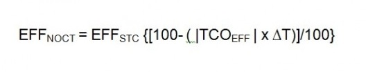 Já, o sistema PV foi configurado no EnergyPlus no modo “Simple”, que é voltado para fases iniciais de projeto, não necessitando da especificação do arranjo dos módulos, apenas da área de superfície que estes ocupam. Entretanto, este sistema considerou um módulo disponível no mercado de Pelotas e região, selecionado através de orçamentos disponibilizados por empresas locais. Trata-se do módulo CS6P – 260P da CanadianSolar (15), com tecnologia de poli-cristalino, dimensões (CxLxH) de 1638mm x 982mm x 40mm. Para a simulação PV, um dos dados de entrada trata da eficiência do módulo (EFF), a qual é informada pelo fabricante em 16,16% para uma condição padrão de teste (Standard Test Conditions – STC), onde a potência nominal do módulo de 260W é atingida quando este é submetido a uma temperatura de 25ºC e uma radiação de 1000W/m². Entretanto, para o cálculo de geração de energia foi utilizado o valor de eficiência, levando em consideração uma temperatura média de operação de 45ºC (Nominal Operating Cell Temperature – NOCT). Para verificar este valor, foi utilizada a seguinte equação (16):