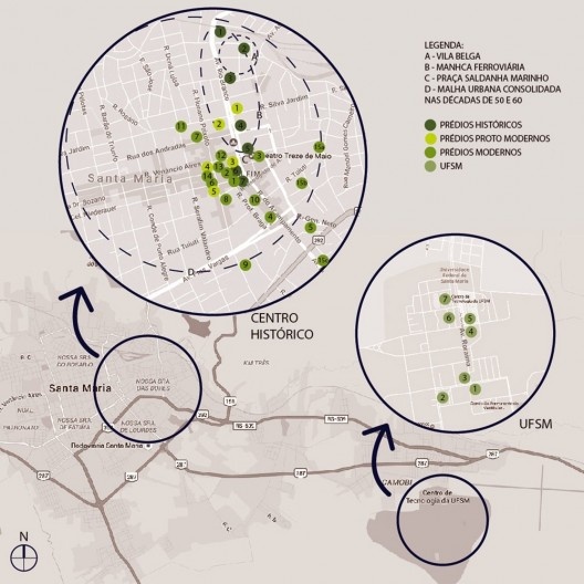 Em relação à localização foram estabelecidos dois grupos. O primeiro localizado no centro da cidade, onde se concentra 70% da amostra. O segundo corresponde aos prédios da Cidade Universitária da UFSM, localizados no bairro Camobi, zona leste da cidade. Esta divisão, além de orientar e facilitar a visitação aponta para duas formas de manifestação da arquitetura moderna: uma adaptada à malha urbana consolidada no centro histórico de origem portuguesa. A outra, no campus de Camobi, inserida num espaço planificado concebido a partir dos conceitos do urbanismo moderno.