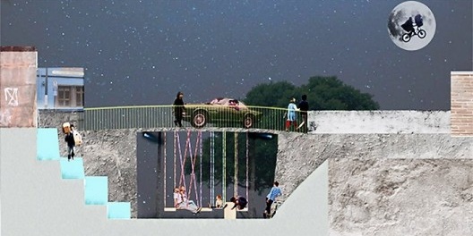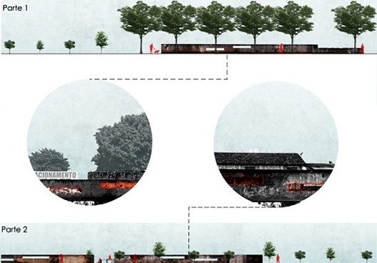Busca em sua intervenção conciliar os limites do território com os muros e entraves. Configura possibilidades de interação espacial radicalizando as fissuras já existentes nas barreiras físicas limítrofes à ferrovia, ampliando essa potencialidade e inserindo equipamentos provisórios, a serem utilizados pela diversidade de pessoas que habitam o lugar, por vezes invisíveis ao olhar dominante da cidade. Seus andaimes e aparatos acoplados aos muros gerariam apropriações inesperadas integrando sua atmosfera, de alguma maneira, aos significados mambembes do lugar.