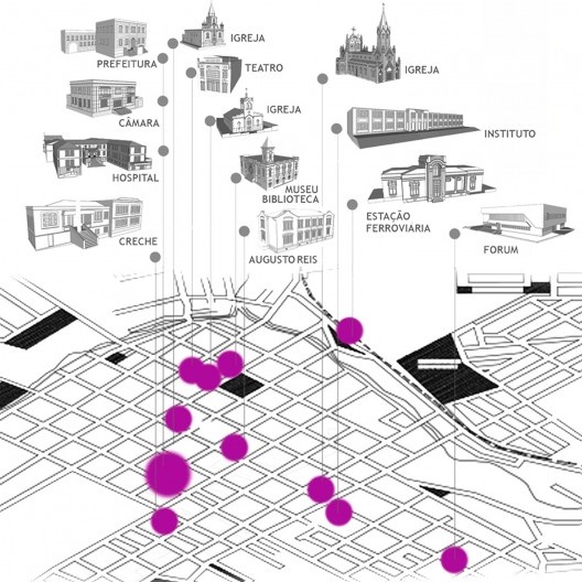 Na reconstrução dessas camadas, um olhar cuidadoso orientou a seleção de três escalas: a arquitetônica, com a transformação dos edifícios públicos acessíveis de valor histórico; a urbana, no desenvolvimento de uma trama urbana 100% acessível; e a territorial, a partir da concepção de um “Percurso Ecológico entre Reforma Fundiária e Jardim Produtivo: o Sistema Ecológico Territorial composto pelas sete rotas de São Manuel”, com introdução de agricultura alternativa. Uma abordagem resolutamente aberta do urbanismo à arquitetura, da pequena escala àquela mais ampla. A partir das tramas derivadas dessas narrativas e imagens, na escala urbana e na territorial, buscou-se recompor memórias para pensar o futuro da cidade em seu território mais amplo.