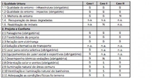 Através da aplicação de todos os critérios contidos no selo Casa Azul Caixa nas residências em estudo, foi possível realizar a síntese dos resultados que se encontra demonstrada no Quadro I. O quadro foi preenchido com um “S” quando o critério foi atendido, com um “N” quando o critério não foi atendido, e com “n.a.” quando o critério não se aplica – em função da data das obras terem sido realizadas nas décadas de 1970 e alguns dados relativos às obras serem inexistentes.