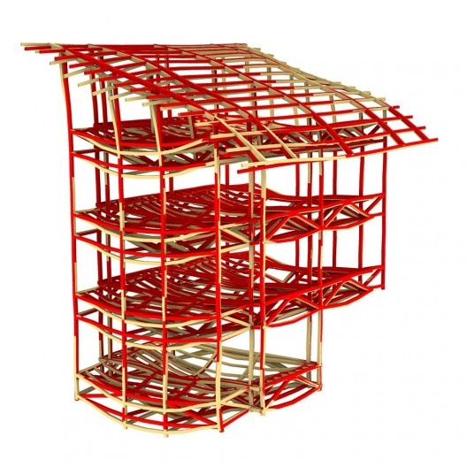 A escada não tem função estrutural, porém atua como poço de ventilação trazendo o ar frio produzido embaixo da estrutura e conduzindo o ar quente para as saídas no andar superior.