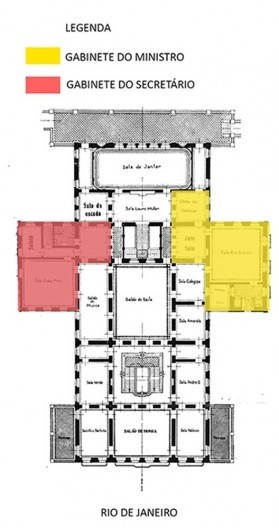 A organização espacial do palácio carioca é muito semelhante, apesar das proporções diferenciadas. A planta do palacete é cruciforme e não quadrada, como a do palácio de Brasília, mas foi mantida neste último a disposição dos gabinetes do Secretário de Estado e do Ministro das Relações Exteriores simétrica em relação aos ambientes centrais. No Rio, assim como em Brasília, temos de um lado a sala do Ministro e do outro a do Secretário, separados por uma série da ambientes para para cerimônias: o salão de honra, o salão de baile e a sala de jantar. Essa organização espacial foi implementada após a reforma administrativa realizada por Maurício Nabuco, o mesmo que convidou Lucio Costa para trabalhar no Setor de Patrimônio do ministério na década de 1930. Segundo Wladimir Murtinho, trata-se “de uma velha tradição que dizem que o secretário-geral, não deve ficar demasiado perto do ministro, para [ter] tempo de pensar, quando é chamado, como é que ele vai explicar o assunto” (19).