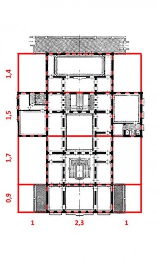 As relações entre largura e comprimento em planta, nos ambientes do palacete carioca, são baseadas em proporções áureas, princípio também adotado no desenho da fachada. Niemeyer não segue a mesma regra e os condicionantes das proporções do edifício são de ordem estrutural, ou de atendimento às exigências do programa ou ainda fruto da sensibilidade do arquiteto. Ainda assim, ao sobrepor as plantas dos dois palácios, notamos que a proporção do volume principal do palacete carioca corresponde à proporção interna do vestíbulo.