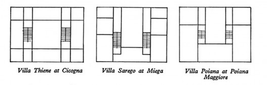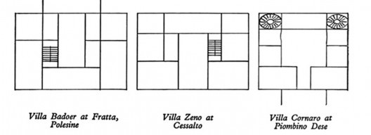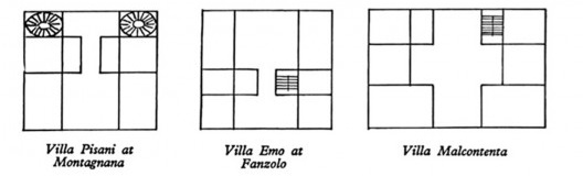 “Projetando mansões e palácios, Palladio seguiu algumas normas precisas das quais nunca se distanciou. Exigia uma sala situada no eixo central do edifício e uma absoluta simetria entre os ambientes menores aos seus lados. "E se deve advertir, que aquelas salas da parte direita correspondam, e sejam iguais às da esquerda: de modo que a construção seja igual em uma parte como na outra" (21).