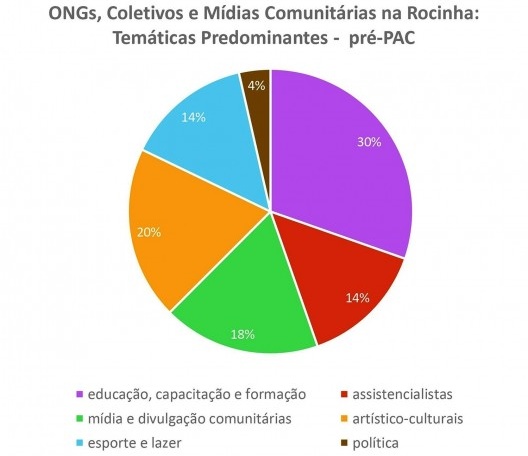 Em outubro de 2018, a pesquisa iniciou um levantamento de ONGs, coletivos e mídias comunitárias que atuam na Rocinha para verificar se houve um aumento da participação comunitária pós PAC Social. O levantamento continha informações de cada iniciativa como ano de fundação, endereço, público alvo, responsável/grupo coordenador, se fundada ou não por moradores, apoio/patrocínio, tipo, atuação interna ou externa à comunidade, dentre outras. Classificamos as iniciativas segundo o ano de fundação – antes ou depois do início do PAC Social na Rocinha – e segundo as principais temáticas, visando contribuir para a compreensão da dinâmica da participação comunitária depois do PAC UAP, e avaliar se houve mudança nos níveis de engajamento da população (8).