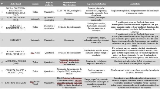 Os procedimentos metodológicos elencados nas pesquisas desenvolveram métodos que avaliam o desempenho de calçadas e o planejamento de rotas acessíveis. É importante destacar a participação dos usuários na utilização dos métodos, visto que as pesquisas se desenvolveram a partir de entrevistas, para compreender o que mais afetavam as pessoas durante seu deslocamento e orientação espacial nas calçadas.