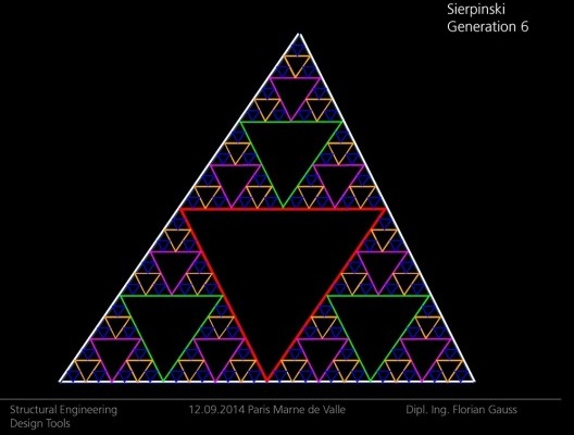 Claro, nós desenvolvemos o programa que gera primeiro a geometria fractal do triângulo de Sierpinski, o que é bastante simples. Há o triângulo de Pascal que dá o mapa inteiro da subdivisão de Sierpinski e é uma série de números. Então esse tipo é o método mais sofisticado, mas você também pode fazer completamente geométrico, apenas pegue a metade dos lados do triângulo e coloque um ponto lá. Ambos os métodos irão dar o mesmo resultado. Então você tem a geometria, e a geometria é o único dado de entrada, você precisa de três pontos. Eu também dei aos perfis uma direção, pois nós precisamos orientar os perfis em direção do sistema de grelha não-ortogonal do prédio principal.