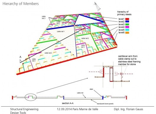 FG: Claro que eles são todos geometricamente relacionados. Você conhece a história: painéis, iterações de Sierpinski, e no meio uma rede de cabos. Você tem seis gerações, no meio você tem os triângulos maiores que são sempre deixados abertos, e eles vão receber a rede de cabos. A coisa legal é que a maneira estrutural de pensar está expressa na hierarquia e na profundidade das vigas. Pois você sempre tem a viga menor descarregando na viga maior. Você tem vigas grandes e as próximas são curtas, então são menores, elas descarregam em si mesmas e vão ficando cada vez menores. Porque a carga nas vigas sempre fica menor, a seção da viga pode ser menor também. Tem uma lógica interna muito forte. Claro, portanto você pode colocar em diferentes níveis, elas não estão na mesma camada. Elas estão todas, como você provavelmente sabe em uma diferente camada. O que dá esse efeito plástico 3D que enfatiza a hierarquia dos membros.