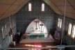 La iglesia presenta una estructura liviana de acero completamente apernada (tipo mecano), sus fundaciones son a base de piedras negras (quemadas en horno) emplazadas en rieles y un terraplén.