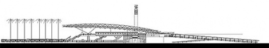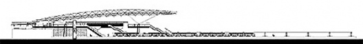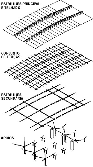 A estrutura da cobertura se organiza no sentido longitudinal da edificação, com três linhas de apoio no centro das plataformas, num intercolúneo de 51m. Cada um desses apoios em concreto armado se ramifica em quatro apoios metálicos, contraventando dessa forma o entramado de vigas e reduzindo o vão principal para 40 m com balanços de 14m nas extremidades.