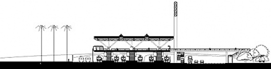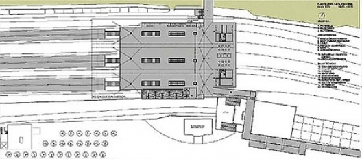b) Portaria e estacionamento: A portaria destina-se ao controle de acesso de veículos dos funcionários da estação e de manutenção da ferrovia e veículos de porte médio para abastecimento das lojas do mezanino. O estacionamento tem 10 vagas, sendo 2 delas privativas para ambulância e viatura policial.