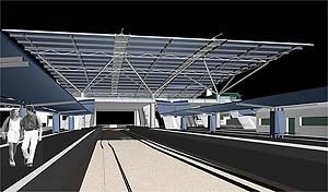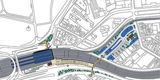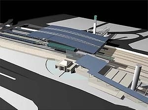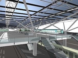 A área comercial conjugada à passagem de pedestres, uma rua 24 horas, fica organizada entorno de uma praça no ponto mais baixo da cobertura, permitindo daí a visão total do espaço da estação e da paisagem distante.