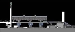 Temos assim a ampla cobertura característica das estações ferroviárias, aqui aberta para o panorama circundante, sobre um mezanino de estrutura independente, que segue as lógicas de seu leiaute conjugado com o das plataformas de embarque.