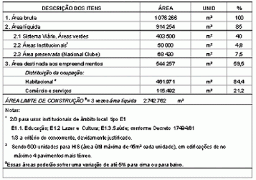 O quadro de áreas disponíveis e as diretrizes básicas para a composição da mescla de usos são as seguintes: