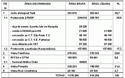 - deverão ainda ser consideradas as intervenções em andamento em outras instâncias de governo, como a despoluição do Rio Tietê, a implantação da estação aero-ferroviária Água Branca (linha expressa Água Branca – Aeroporto Internacional de Guarulhos) e os planos da CPTM e da Rede Ferroviária Federal e suas concessionárias para a modernização dos equipamentos e serviços das ferrovias e para a destinação de seus patrimônios imobiliários;