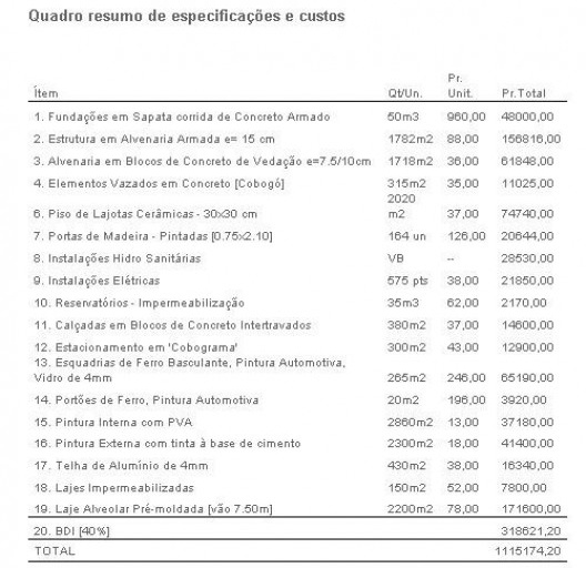 Para uma melhor avaliação dos custos e viabilidade do empreendimento alguns parâmetros do projeto foram assim resumidos: