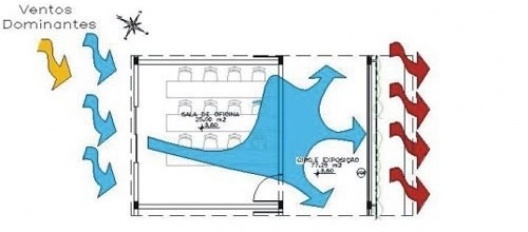 Na fachada frontal, o anexo possui uma fachada verde com intuito de sombreamento e também no padrão estético do edificio, a ventilação oi feita através de brises de madeira, para entrada de ar e não de calor. Foram utilizados sistemas de captação de água da chuva através de caixas d`água secundárias.